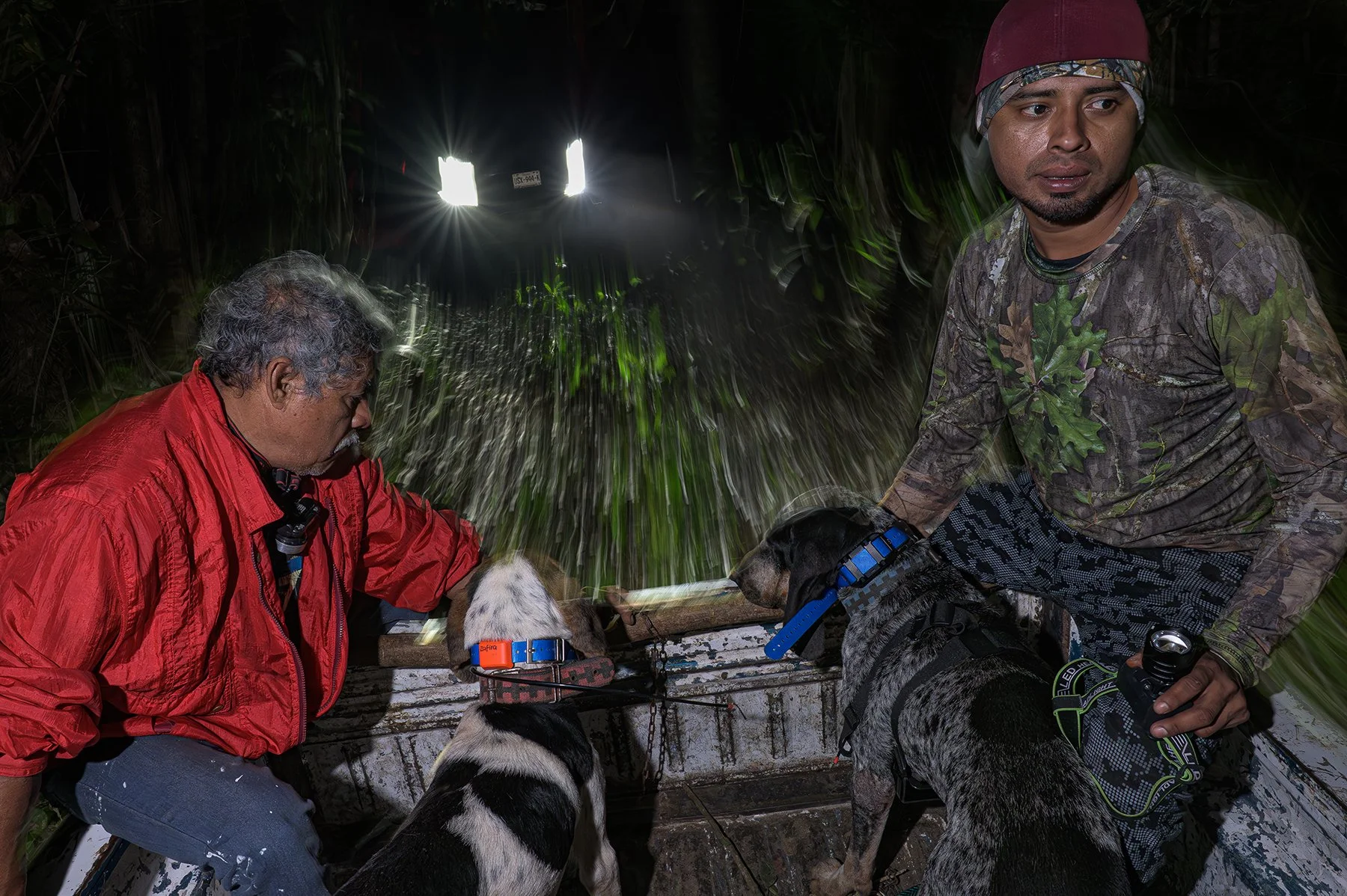 Early in the morning, the jaguar trackers and their hounds sit in a truck’s pickup while driving through the jungle.
