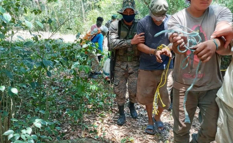 Mirador Park rangers lead illegal loggers, allegedly part of a Chinese syndicate, out of the forest. Photo courtesy Francisco Asturias.