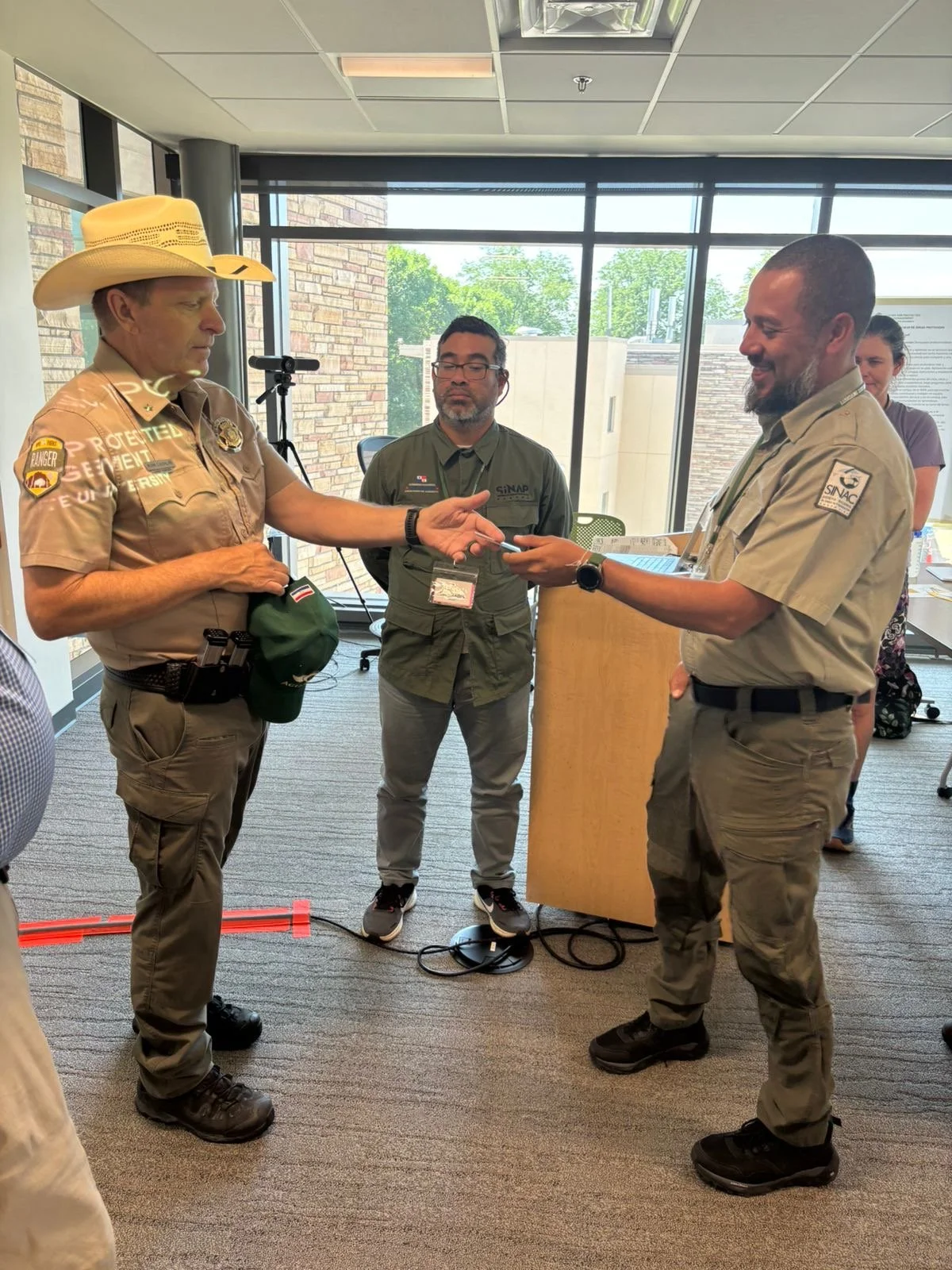 Marcos is honored by a Chief Ranger from the U.S. National Park system—a powerful moment of ranger-to-ranger recognition across borders.