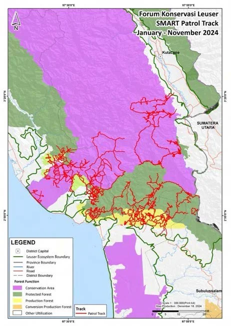 The FKL Wildlife Protection Teams have made significant progress in safeguarding the biodiversity of the Bengkung Trumon Megafauna Sanctuary (BTMS) and the Suaq region from January to November 2024. Eight Wildlife Protection Teams conducted 88 patrol missions, covering 5,807 km, documenting vital wildlife presence through sightings, including 1,896 orangutans, 1,182 Malayan bears, 844 Sumatran tigers, and 221 Sumatran elephants.