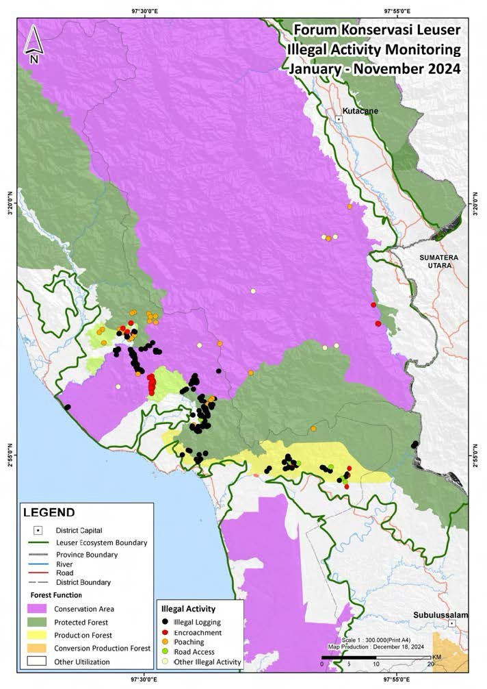 In addition to protection efforts, restoration and community engagement have been key priorities. The Pasie Lembang Nursery produced over 5,700 saplings, distributing and planting 2,132 of them across 21 hectares of previously degraded land. Wildlife sightings, including orangutans and Malayan bears, in these restored areas highlight the success of these initiatives. The Suaq Community Patrol Team conducted five patrols, covering 893.2 km and documenting forest encroachment threats. Collaboration with local communities and authorities remains central to resolving challenges, including encroachment by former combatants and threats to conservation facilities. These combined efforts underline FKL’s commitment to protecting the Leuser Ecosystem's biodiversity while promoting sustainable community practices.