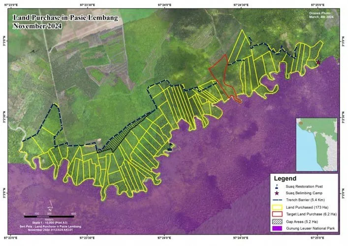 As mentioned in the previous report, we have successfully secured an additional 6.61 hectares, bringing the total to 173.6 hectares, which were secured with the support of Global Conservation and other donors. Our current target is the 6.22 hectares marked in red. Once this area is secured, the total secured area in Suaq, specifically within the Other Land Use area in Pasie Lembang village, Subulussalam subdistrict, will increase to 178.7 hectares.