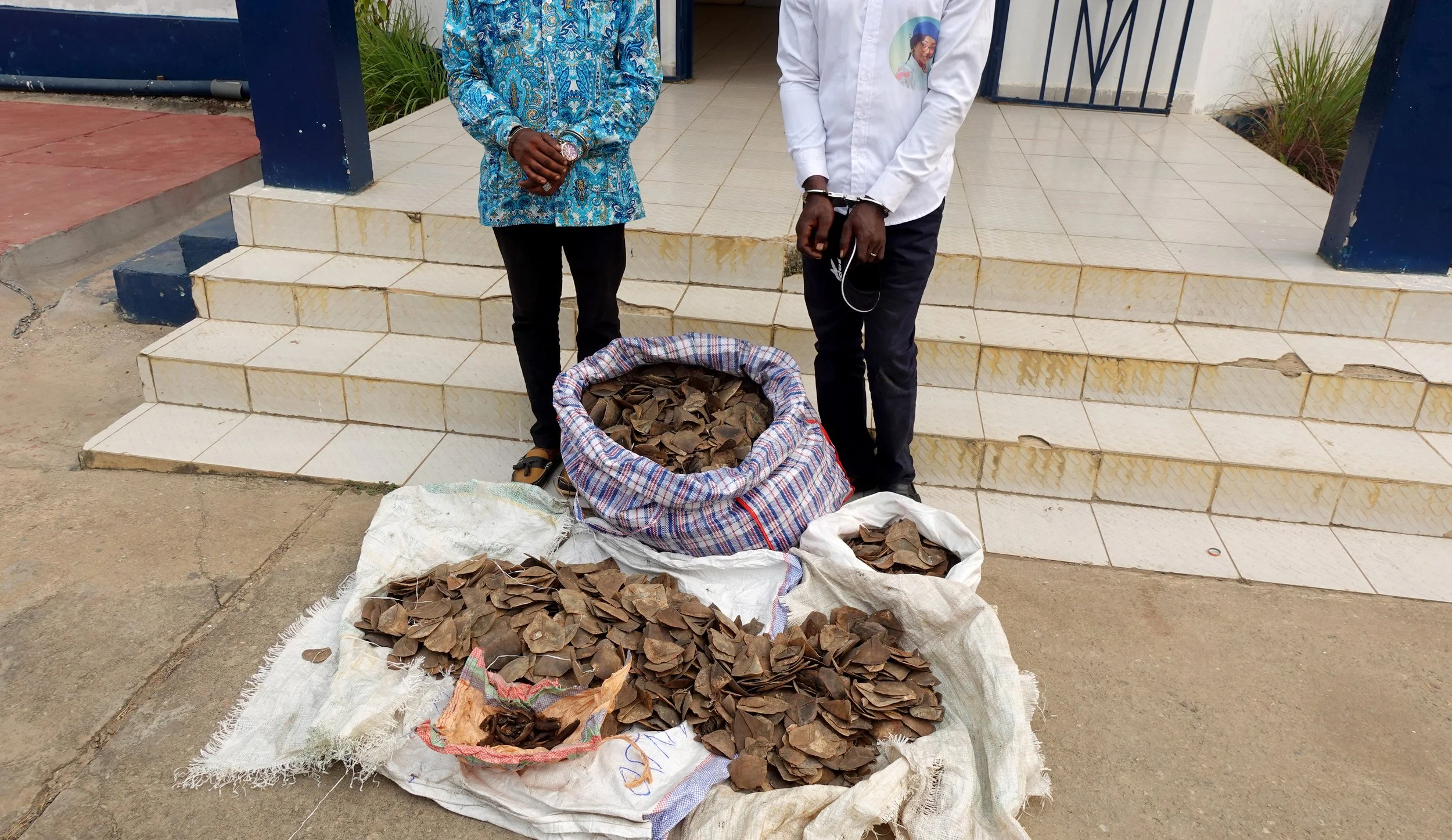 Two traffickers were arrested with 81 kg of scales of endangered giant pangolins and 24 nails in the north of the country. One is a priest, while the other is a worker contracted by the city council to lay fiber optic cables around villages—both used their positions to trade in pangolin scales mainly with Chinese nationals. This seizure represents the remains of about 40 individuals of this endangered species, which is racing toward extinction, and serves as only a small glimpse into the ongoing trade conducted by the two traffickers who were arrested. The traffickers hid the scales in a car tire to evade control by wildlife officials while moving them around. They ran a network of several smaller traffickers.