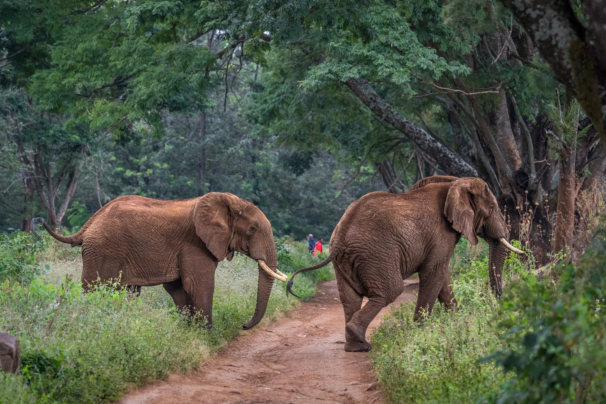 Two african elephants hurry out of farmland as they’re being chased by the Human-Wildlife Officers of the African People & Wildlife team.