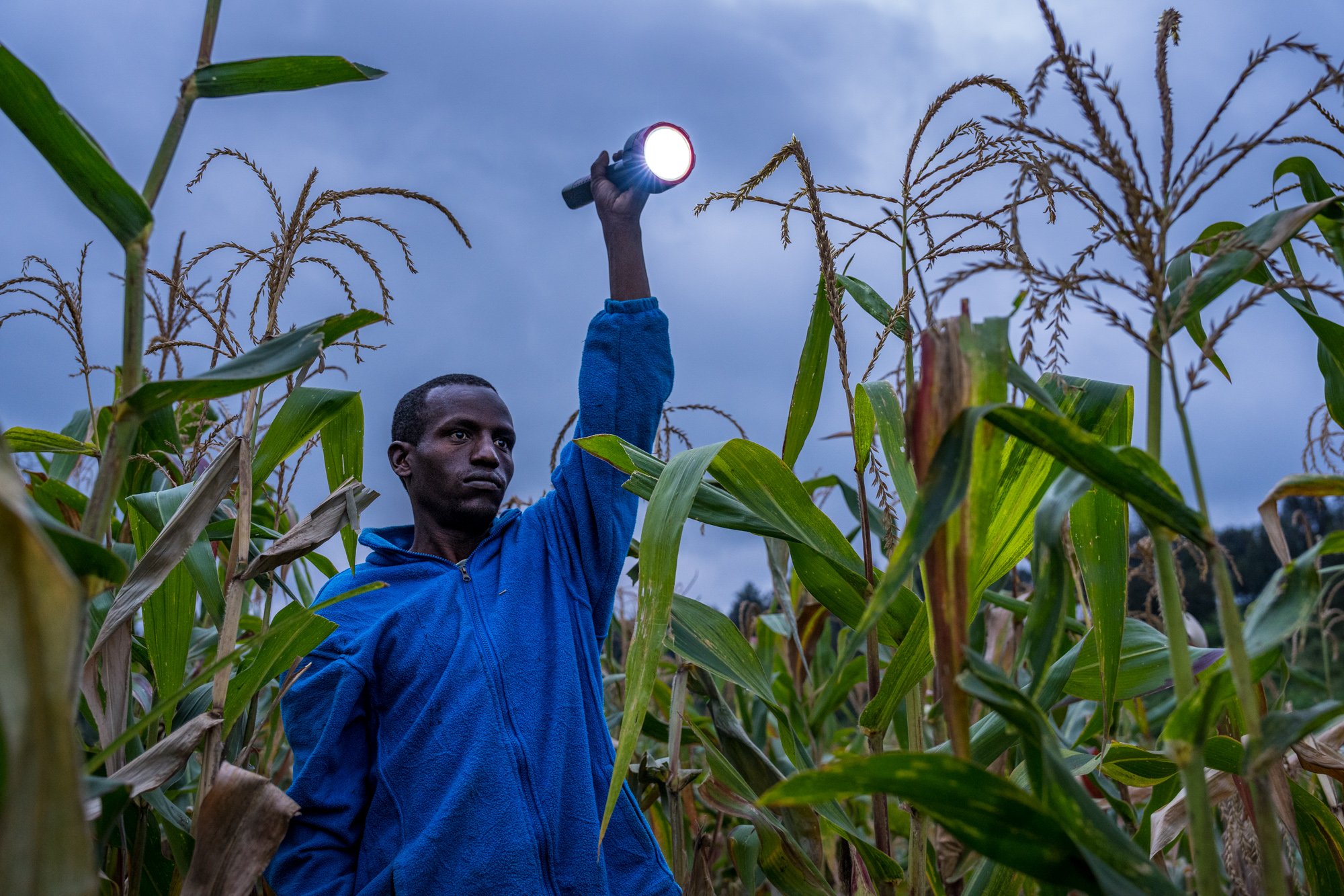 A farmer shows where his crops were raided just moments before he worked to chase the elephants out and then was supported by the Human-Wildlife Conflict Officers.